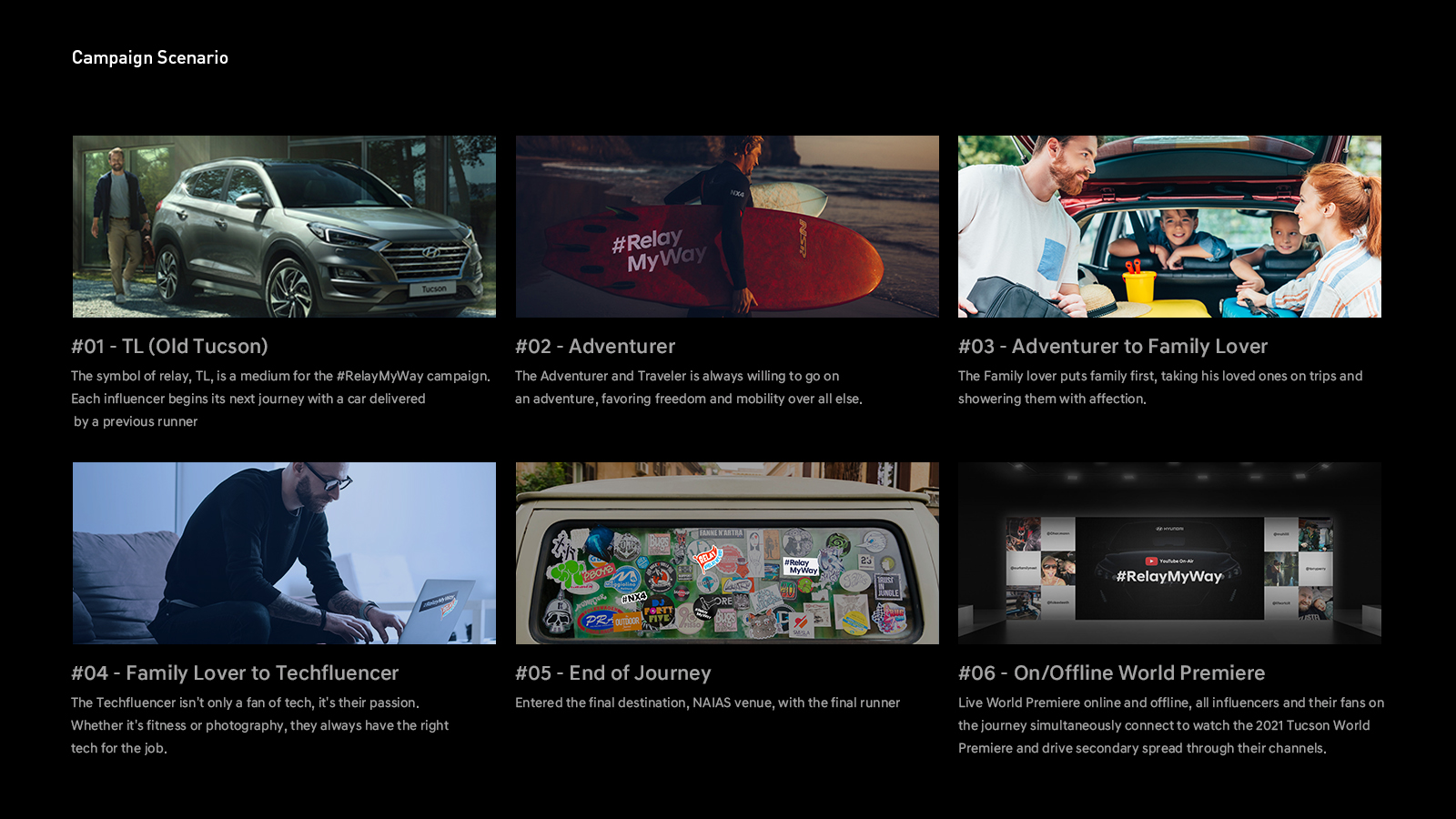 EIDETIC designed a two-track, on/off-line integrated world premiere which would be adaptable to whatever the outcome of NAIAS 2020. To make a world premiere campaign that attracted target customers and induced voluntary participation, we conducted the ‘#Relay My Way’ Campaign which was carried out with influencers. We planned to express the charm of Tucson through their own voices.
